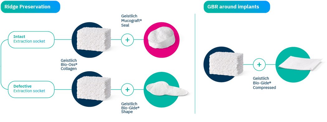 Geistlich Bio-Oss® Collagen is ideal for Guided Bone Regeneration, particularly for Ridge Preservation after tooth extraction and bone regeneration around implants.
