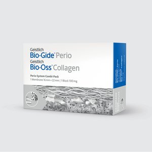 Perio-System Combi-Pack kombiniert Geistlich Bio-Oss® Collagen 100 mg und Geistlich Bio-Gide® Perio 16 x 22 mm. Bei gemeinsamer Verwendung eignen sie sich optimal für regenerative parodontale Behandlungen.