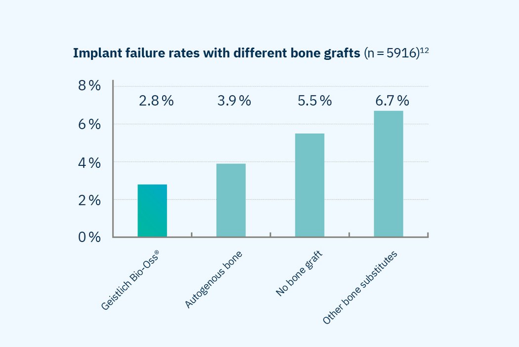 - Superior implant survival rate: Clinical evidence shows that using Geistlich Bio-Oss® as a bone graft material achieves implant survival rates above 97%, outperforming sites without grafting and those treated with other bone substitutes.12
