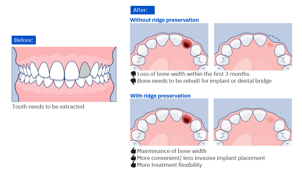 After tooth removal, a bone graft can be placed in the empty space to prevent bone loss. This helps keep the jawbone healthy and gives the patient the option to replace the tooth later with an implant or a dental bridge.