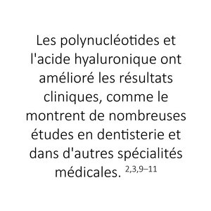REGENFAST® associe les polynucléotides à l'acide hyaluronique, en utilisant leurs effets synergiques pour stimuler la réparation des tissus oraux et favoriser la croissance et la vitalité des cellules. 2–5