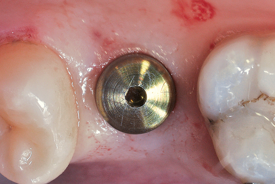 Con i Geistlich Biomaterials si è impedito un riassorbimento severo della cresta. Un risultato gradevole a lungo termine è stato raggiunto tramite un ulteriore contornamento con i Geistlich Biomaterials e un innesto di tessuto connettivo al momento dell’inserimento dell’impianto.
